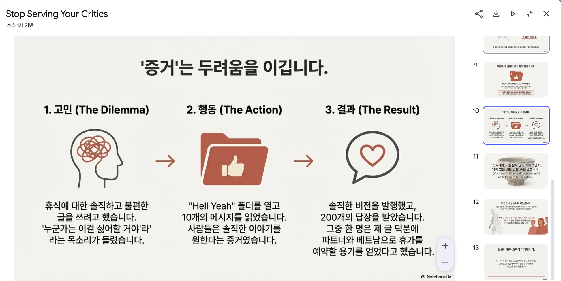 저는 스마트폰을 바꾸면서 얻은 Google AI Pro 플랜을 통해 이 기능을 적극적으로 활용하고 있습니다. 한글로 요약된 슬라이드를 먼저 훑어보면 전체 맥락이 잡히고, 인지 자원의 소모를 최소화하며 빠르게 정보를 판단할 수 있습니다. 여러분의 정보 습득 파이프라인에 꼭 한번 추가해 보시길 권합니다.