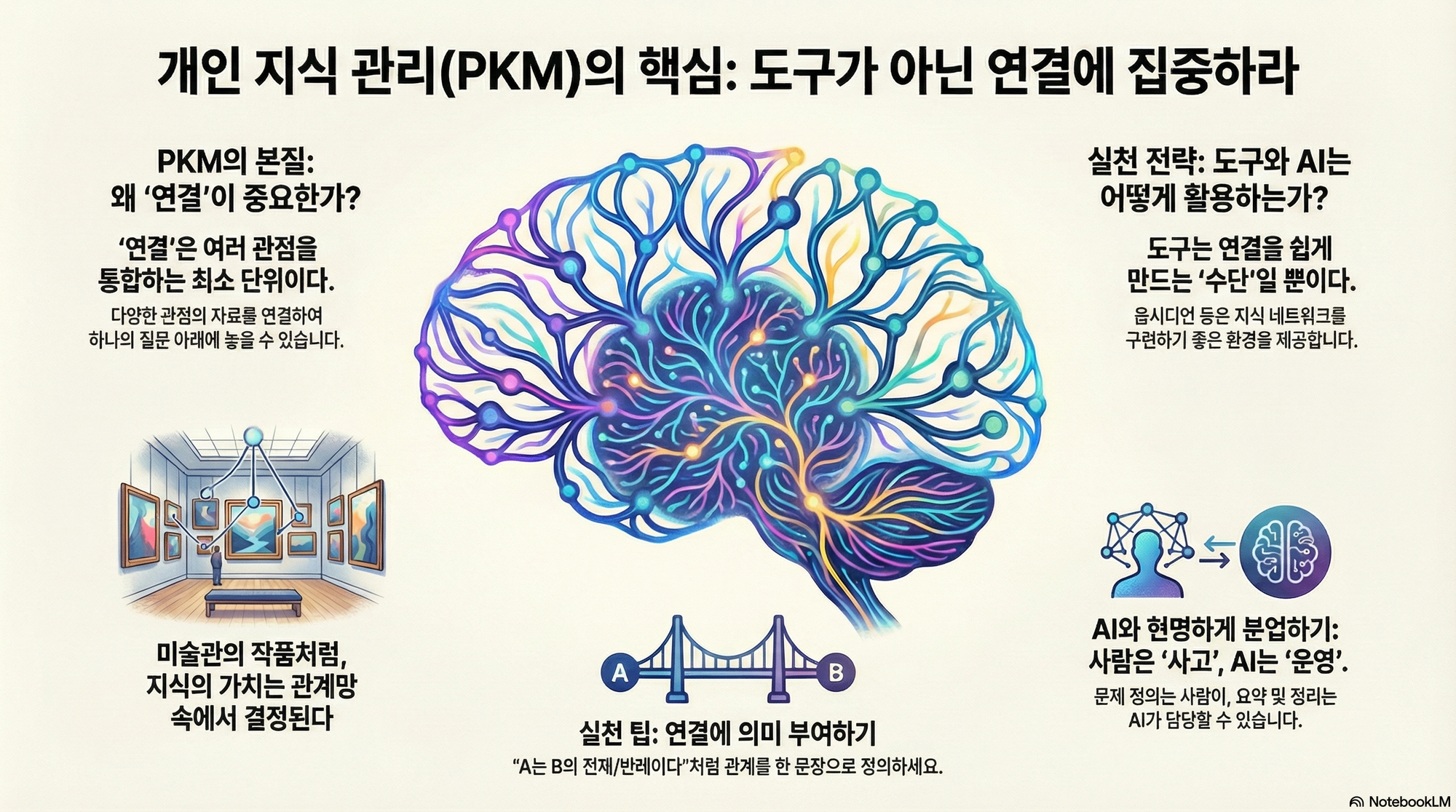 AI는 여기서 '본질을 훼손하지 않는 보조 장치'로 두는 편이 생산적입니다. 사람이 해야 하는 일은 문제를 정의하고, 의미를 판단하고, 우선순위를 결정하는 일입니다. 반면 시간이 오래 걸리고 반복되는 운영 작업(요약 정리, 포맷 정돈, 연결 후보 제안 등)은 AI가 맡을 수 있습니다. 이 분업이 유지될 때, 개인지식관리의 목표는 '연결 만들기'가 아니라 '연결을 통해 지식을 실제로 활용하기'로 돌아옵니다.