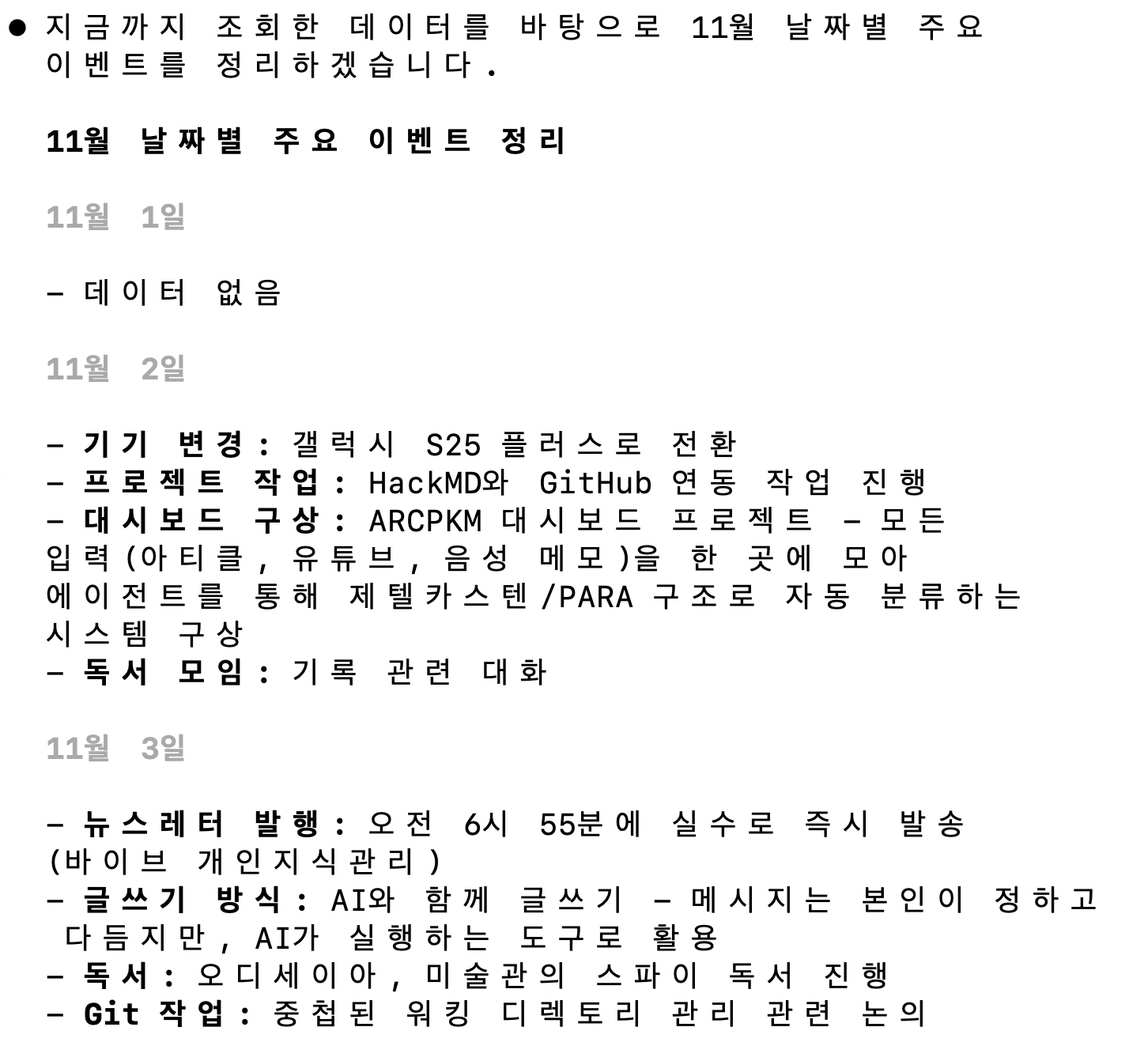 가장 큰 변화는 심리적인 부분입니다. 스마트폰이 옆에 없어도 괜찮습니다. 떠오르는 생각을 즉시 말로 남기면 되니까요. AI를 통해 나중에 물어보고 답변을 받을 수 있습니다. 그리고 MCP(Model Context Protocol)를 통해 Claude에서도 대화하면서 뽑아낼 수 있습니다.